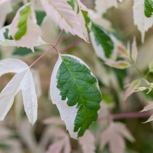 Matiggroeiende boom of struik met opvallend mooi handvormig ingesneden blad: dit is bij het uitlopen lichtroze getint en verkleurt later witbont. Bladverliezend, verdraagt goed regelmatige vormsnoei en tamelijk natte grond. Voor een zonnige standplaats. Ook als struikvorm verkrijbaar, zie hiervoor bij GEWONE SIERSTRUIKEN.