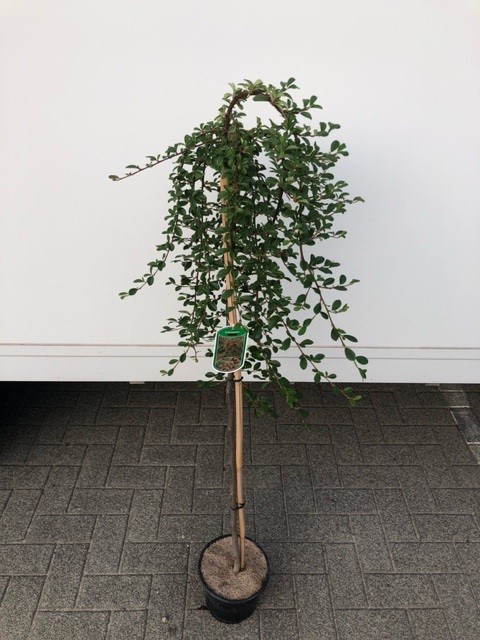 Bladhoudend en kleinblijvend treurboompje, met donkergroene ronde blaadjes. Bloeit in de lente met kleine witte bloempjes, draagt rode bessen in de herfst. Te lange takken mogen regelmatig snoeid worden; stammetje blijft steeds even lang.
