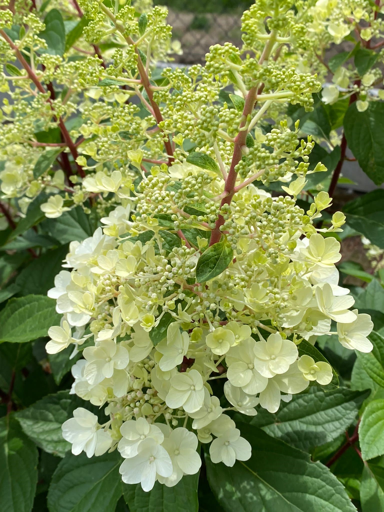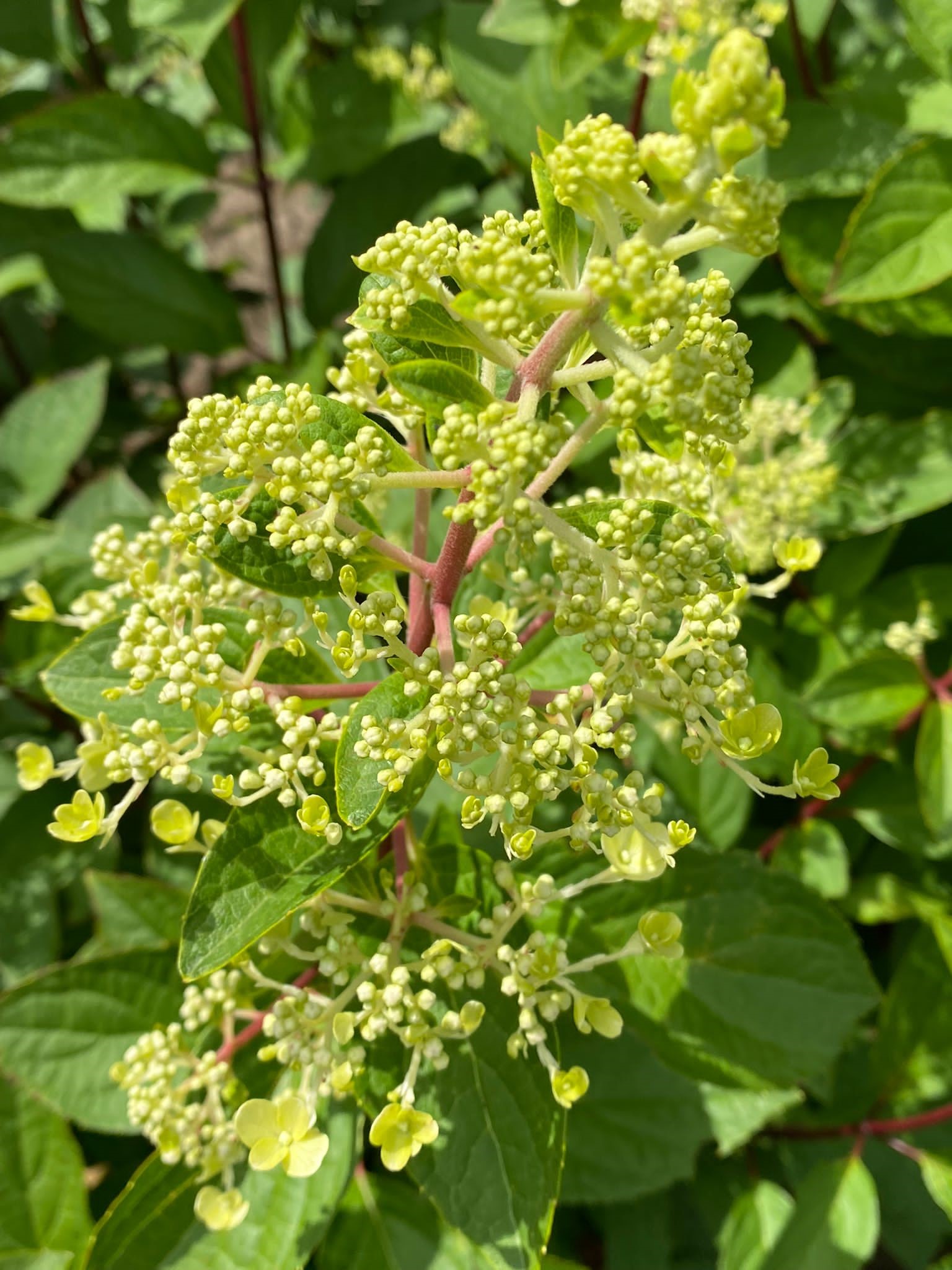 Nieuwe soort houthortensia. Opgaande struik met stevige takken. Bloeit van eind juli tot okt. met opstaande kegelvormige bloemen, bovenaan wit, onderaan verkleurt de bloem donkerroze. Jaarlijks in maart kort terugsnoeien. Zon en halfschaduw; hoogte tot 1,50 m. Plantafstand: wanneer meerdere planten van deze soort in een groep geplant worden, plant men deze best op 80 cm tot 100 cm van elkaar.