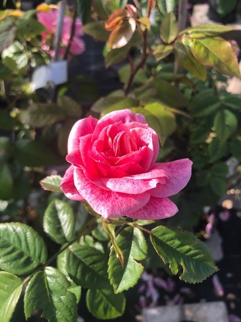 Grootbloemige tweekleurige klimroos: witte bloemen met een roze rand. Zeer rijkbloeiend: bloeit vanaf juni de ganse zomer. Plantafstand: 1 meter. Jonge planten weinig snoeien,later te lange takken insnoeien en de oudste takken wegsnoeien.