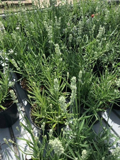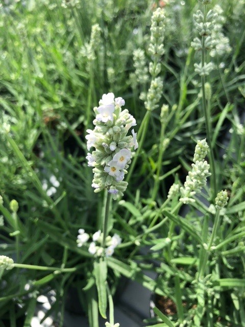 Lavendel is een zeer populaire tuinplant en wordt zeer veel aangeplant, als afboording, in groepen en als bodembedekker. Dit is een Lavendel soort met lijnvormige grijsgroene blaadjes en kleine witte lipbloemen welke op lange stelen (schijnaren) uit de plant reiken. Goed winterhard. Snoei: voor de winter alleen wat fatsoeneren door de langste toppen en de versleten bloemen weg te snoeien. Eind februari of begin maart dient men de planten tot op 10-15 cm terug te knippen. Dit jaarlijks terugsnoeien is absoluut noodzakelijk om een mooie gevulde plant te behouden. Deze soort bloeit van juni tot september. Voor een zonnige standplaats op een normale of droge grond; gedijt niet op natte gronden. Lavendel slechts matig bemesten, want anders groeit deze te sterk en valt de plant gemakkelijk open.
