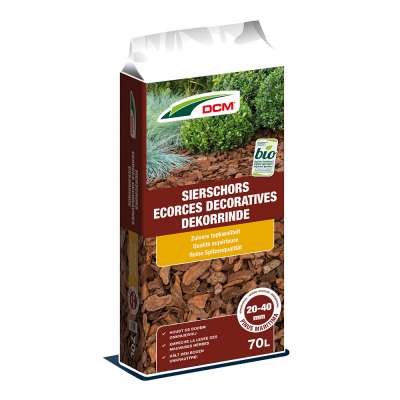 Decoratieve boomschors is afkomstig van 1 bepaalde naaldboom. Het zijn mooie, vrij grote brokken schors met een ruwe oppervlakte, alle stukken hebben een mooi intensbruine kleur. Wordt voornamelijk gebruikt om de bodem in grote potten, kleinere plantenperken en in bloembakken af te dekken, daar waar vooral het mooie uitzicht primeert op de onkruidbestrijding. Voor pure decoratie volstaat een laagje van 2 tot 3 cm, om bovendien ook nog een goede onkruidbestrijding te bekomen dient deze laag 7 tot 8 cm dik te zijn. Door de grootte van de brokken kan er meer lucht tussen, droogt de laag na regen of begieting vlugger op en zal dan ook minder vlug afgebroken worden (= verrotten)dan de gewone boomschors. Ter info : 1m3 schors is 800 liter (geen 1000 liter !)
