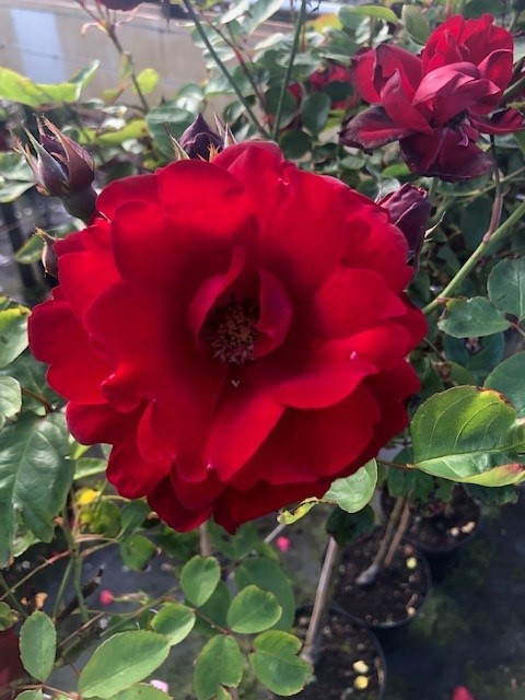Zeer mooie laagblijvende trosroos met gevulde donkerfluweelrode bloemen, bijzonder rijkbloeiend van juni tot oktober. Plantafstand: 35 tot 40 cm, op een zonnige plaats en een goed bemeste bodem. Jaarlijks begin maart snoeien tot op 10/15 cm.